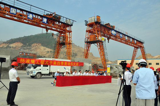 施工單位中國(guó)港灣防波堤項(xiàng)目總經(jīng)理毛洪新在發(fā)言中表態(tài),將加快茂名港博賀新港區(qū)防波堤建設(shè)進(jìn)度,控制工程成本和提高管理水平,“趕進(jìn)度、保質(zhì)量、保安全、保文明施工”。在“大干四季度”活動(dòng)時(shí)間內(nèi),東防波堤推填里程至900m;護(hù)面塊石理坡及扭王字塊安裝及時(shí)跟進(jìn),確保堤身暴露長(zhǎng)度不超過(guò)50m;完成扭王字塊預(yù)制2000塊。