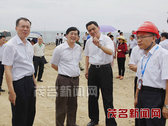 (圖為許光、李紅軍等領(lǐng)導(dǎo)了解博賀新港東防波堤建設(shè)情況)