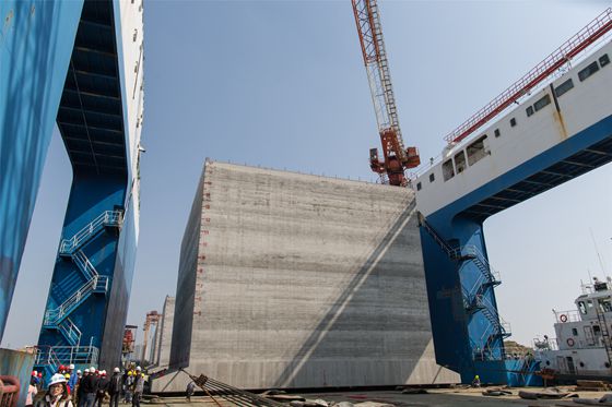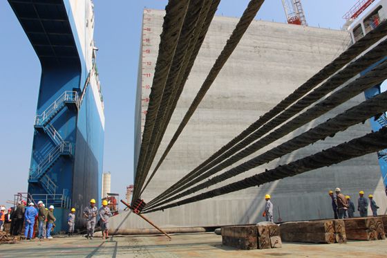 沉箱正緩緩上船