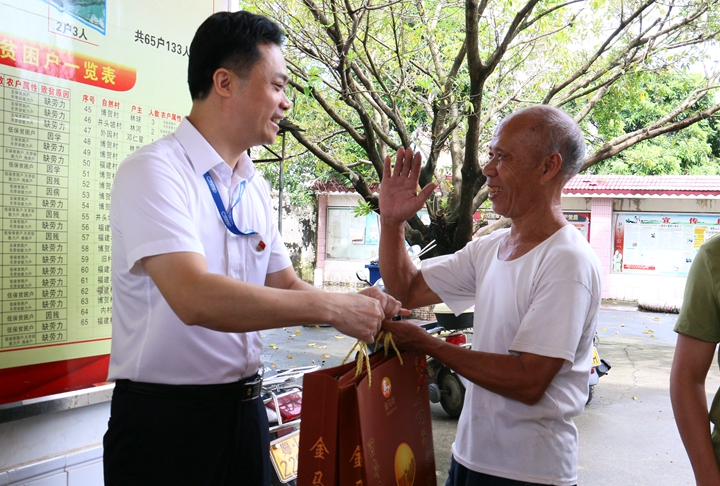 慰問組一行首先來到博賀村委會(huì),向前來的扶貧戶通報(bào)了扶貧工作組近期的工作情況,致以節(jié)日和問候和祝福,并送上節(jié)日禮品。隨后,慰問組進(jìn)村入戶,走訪慰問了行動(dòng)不便的貧困戶,并向他們送上慰問品和問候。每到一處,肖炳璋與貧困戶親切交談,親切了解其生活狀況及困難,鼓勵(lì)他們樂觀面對生活,堅(jiān)定在黨和政府的關(guān)懷下脫貧脫困的信心,并囑咐集團(tuán)精準(zhǔn)扶貧工作小組人員結(jié)合實(shí)際,配合當(dāng)?shù)卮逦,針對不同貧困戶的具體情況,因地制宜、因人施策開展好扶貧工作,結(jié)合上級部門有關(guān)優(yōu)惠幫扶政策,切實(shí)解決他們生活中的實(shí)際困難,確保貧困戶過好國慶及中秋兩個(gè)節(jié)日。