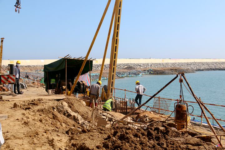 目前,東區(qū)油品碼頭工程,正在實施灌注樁施工,已經(jīng)完成23條。同時進行的還有基槽挖泥施工和靜載試樁平臺搭設以及沉箱底座鋼筋綁扎、建設梁板預制場,其中梁板預制場已經(jīng)完成80%的建設工程,即將具備預制開工條件。