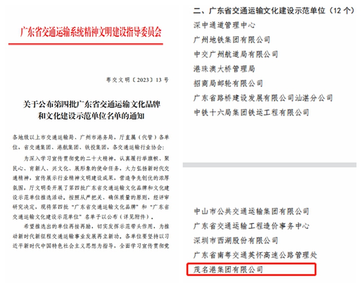 日前,廣東省交通運(yùn)輸系統(tǒng)精神文明建設(shè)指導(dǎo)委員會(huì)公布了第四批廣東省交通運(yùn)輸文化品牌和文化建設(shè)示范單位名單,茂名港集團(tuán)被評(píng)為“廣東省交通運(yùn)輸文化建設(shè)示范單位”。