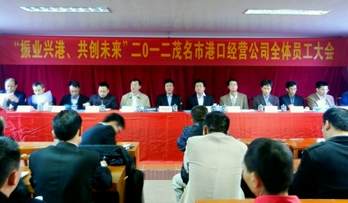 12月6日,茂名市港口經(jīng)營有限公司全體員工大會在港口經(jīng)營有限公司二樓會議室召開。茂名市副市長、濱海新區(qū)黨工委書記、茂名高新區(qū)黨工委書記楊潤貴,茂名市公路管理局局長陳堯,濱海新區(qū)管委會副主任、茂名港集團董事長胡軍,市國資委副主任鄭忠義以及濱海新區(qū)、茂名港集團、港口經(jīng)營有限公司等單位的相關(guān)人員參加了本次會議。